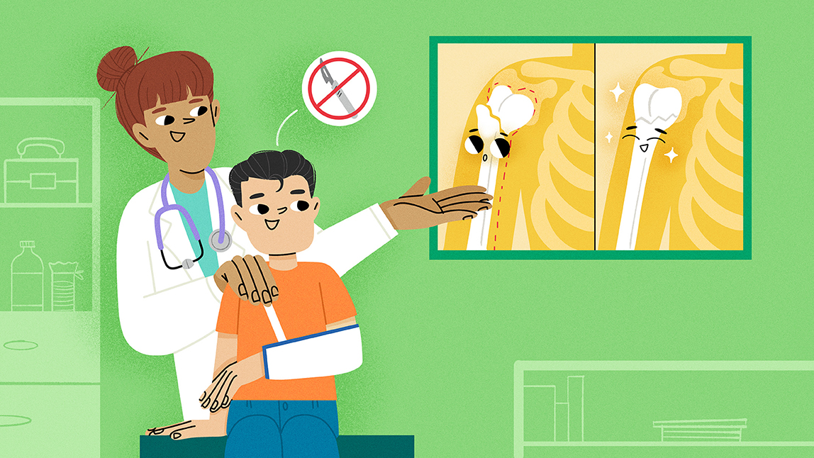 Proximal humerus fractures are a type of break of the upper bone of the arm that occurs near the shoulder. Because of special cartilage areas near the end of each bone called growth plates, kids have a remarkable ability to grow and heal their bones. In a study looking at proximal humerus fractures in kids 10–16 years old, doctors compared the outcomes of kids whose proximal humerus fractures were repaired with surgery with those who did not have surgery. We learned that by 6 months after the injury, there was no difference in pain, movement, function, or mood between kids who received surgery and those who did not. This is an exciting discovery that means in kids whose growth plates are still open, it is possible to avoid the risks associated with surgery and heal proximal humerus fractures without operating.